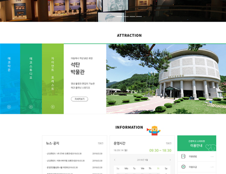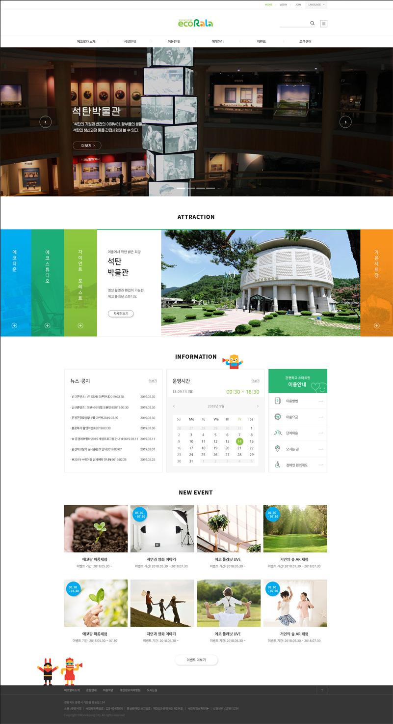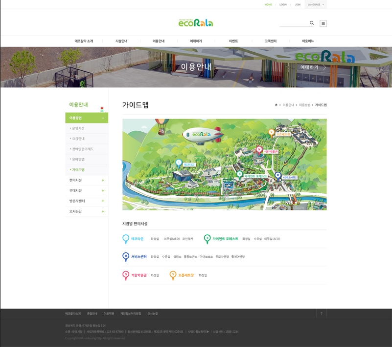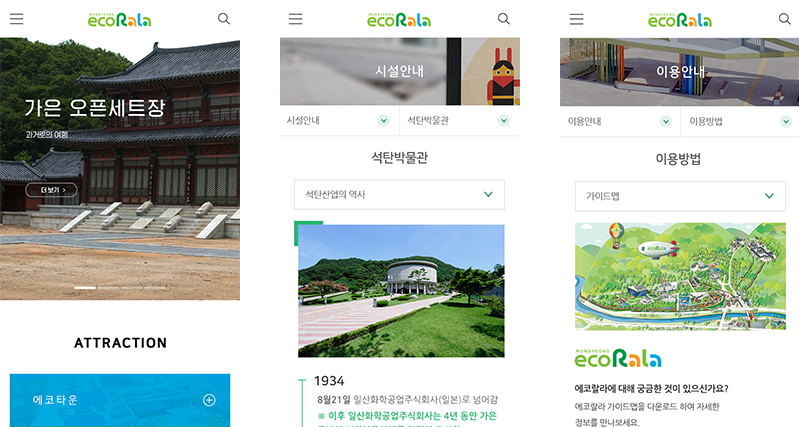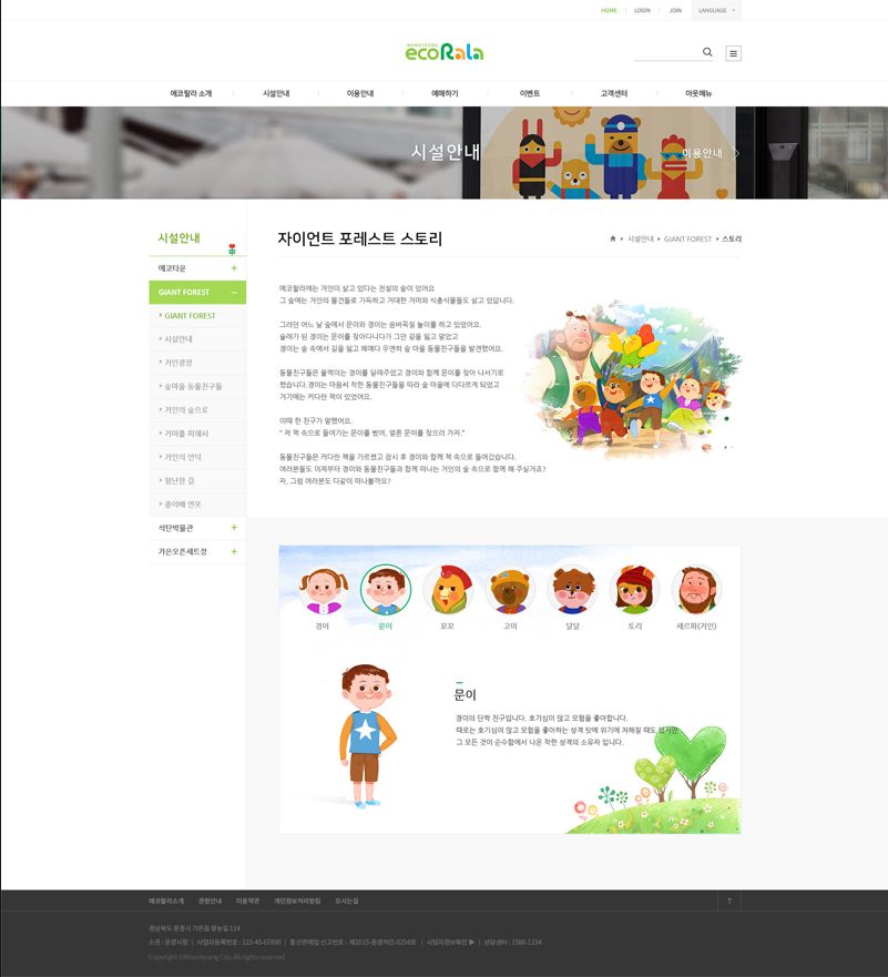 문경 에코랄라에서만 체험할 수 있는 거대한 놀이터인 자이언트 포레스트의 소개 페이지에는 AR(증강현실)을 활용한 체험 영상과 함께 친근하고 아기자기한 캐릭터들의 스토리텔링이 자리잡고 있어 사용자들의 흥미를 일으키고 있습니다. 또한 메인 페이지에 다양한 어트랙션을 모아 배치하여 문경 에코랄라만의 편안한 느낌을 디자인적 요소로 표현함과 동시에 한 눈에 보기 쉽게 구성하여 사용자 편의성을 높였습니다.
