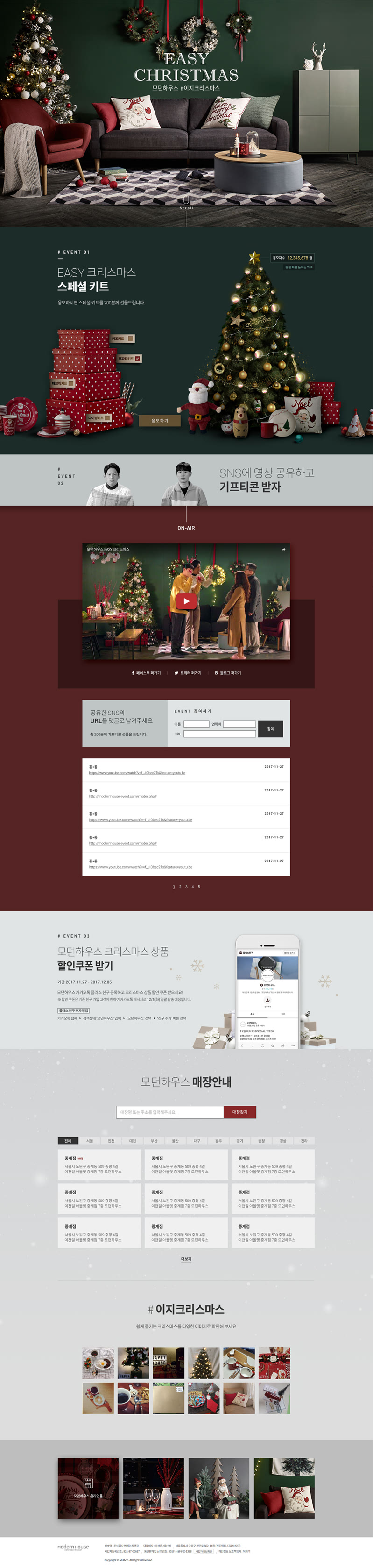 모던하우스에서 런칭한 크리스마스 시즌 이벤트의 성공적인 프로모션을 위해 제작하였습니다. 크리스마스 관련 이미지들을 사이트 전반에 적극적으로 사용함과 동시에 모던한 느낌의 디자인으로 모던하우스 브랜드가 가진 편안하고 세련된 느낌을 효과적으로 어필하였습니다.