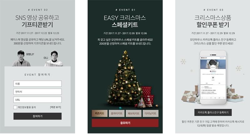 모던하우스 이지크리스마스 이벤트의 효과적인 홍보 진행과 함께 높은 참여율을 이끌어내기 위해 두 가지 이벤트를 순차적으로 배치하되 풀 사이즈 페이지로 배치하여 사용자의 시선을 집중시키고, 쉽고 간단한 이벤트 참여가 가능하도록 제작하였습니다.