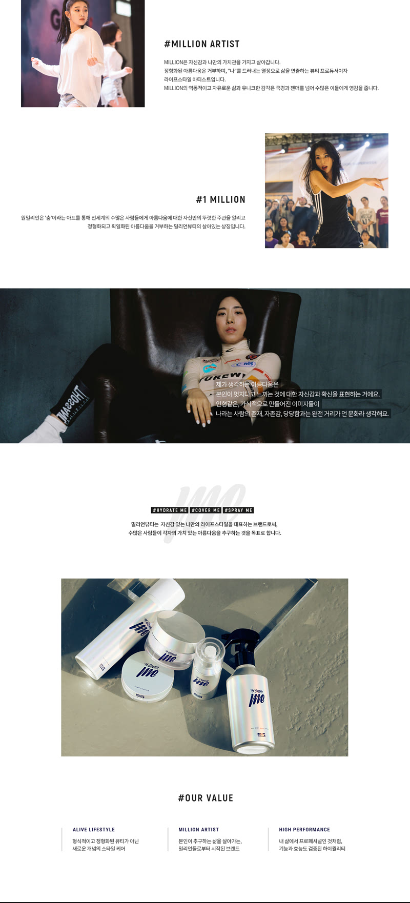 LG생활건강과 세계적인 댄스팀 '1 million'의 콜라보로 탄생한 밀리언뷰티 브랜드의 글로벌 쇼핑몰을 구축하였습니다.